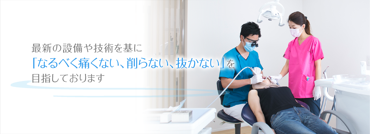 皆さまは従来の歯科医院をどのようにイメージしていますか?「歯が痛いから仕方がなく行くところ」、「怖くて痛い思いをするところ」、「予約しているのに大幅に待たされる」などマイナスなイメージが強いと思います。そこで、当院では「ここに来てよかったと思える安心の医療を目指して」をコンセプトに考えております。最新の設備や技術を基に「なるべく痛くない、削らない、抜かない」を目指しています。特に、予防歯科に重点を置くことにより虫歯の早期発見、最小限の治療を目指しいつまでも御自身の歯でお美味しく食事が出来ることに貢献出来ればと考えております。また、女性歯科医が在中しているため治療に恐怖心が強いお子さまにも安心して臨んでいただけます。